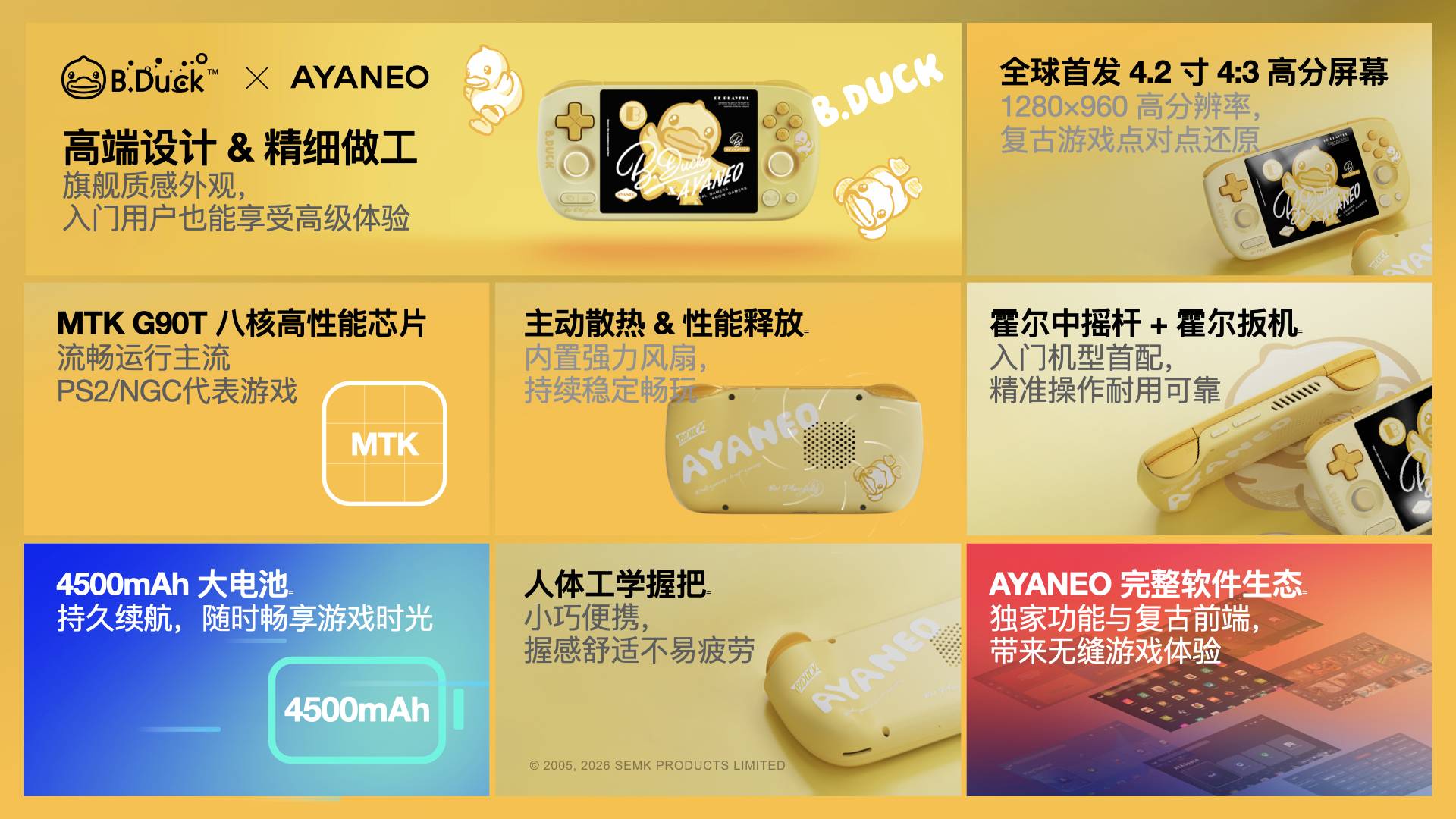 AYANEO Pocket AIR Mini × B.Duck 联名限定款在延续 Pocket AIR Mini 精致小巧机身与人体工学设计的同时,将 B.Duck 标志性的萌趣元素融入整机外观,让掌机在复古与可爱之间焕发全新的活力。轻巧便携的机身搭配萌趣设计,为玩家带来兼具个性与乐趣的掌上体验。4.2 英寸 4:3 高分辨率屏幕,带来纯粹细腻的复古视觉享受;搭载 MTK 八核 G90T 高性能芯片,畅玩经典游戏毫无压力。霍尔中摇杆与霍尔扳机实现精准操控,内置主动散热系统与强力风扇,保障高性能稳定释放,4500mAh 大容量电池提供持久续航。丰富接口配置满足多场景拓展需求,同时享有 AYANEO 自研安卓软件生态的完整支持,让玩家在熟悉的复古游戏世界中,体验更加轻松流畅的掌上游戏乐趣。萌趣设计与复古体验相结合,让这款联名限定掌机成为兼具情怀与个性的惊喜之作。